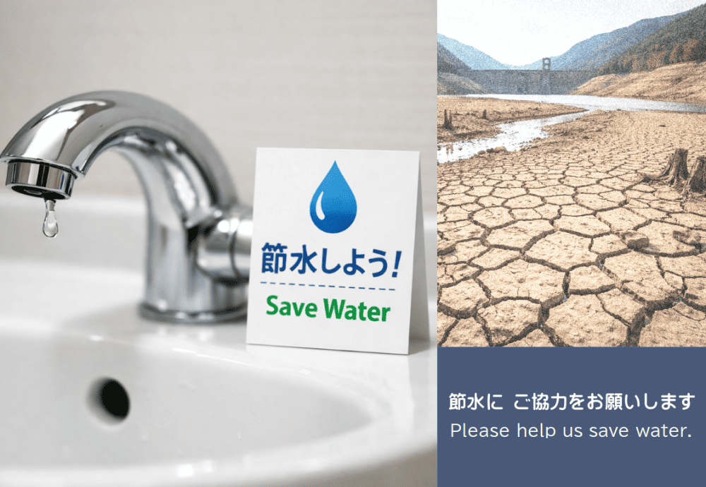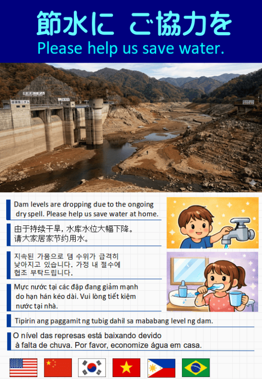 無料チラシ東日本・西日本の太平洋側を中心に記録的な少雨が続いており、水道水や農業用水の水源であるダムの貯水率が大きく低下しています。節水を呼びかけている自治体も多くなっています。「節水チラシ」を3種類作成しました。ご自由にお使いください。