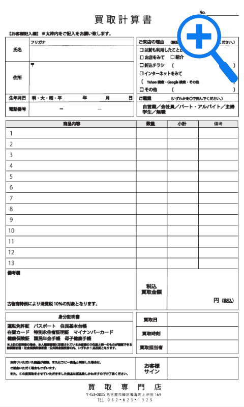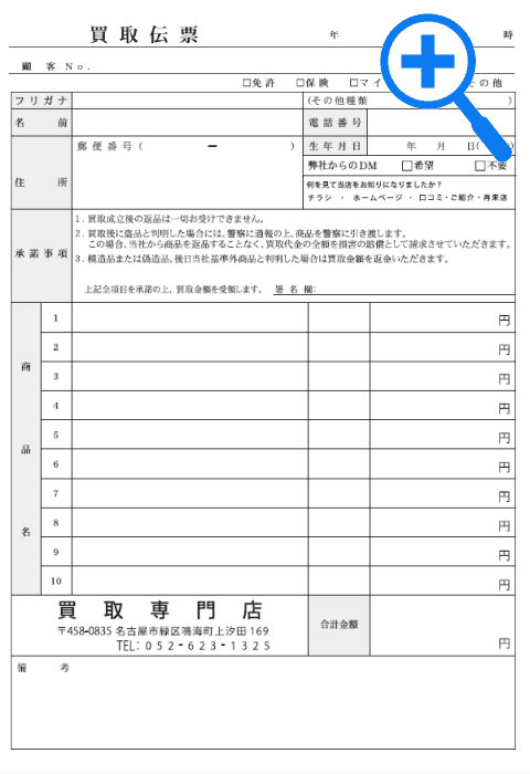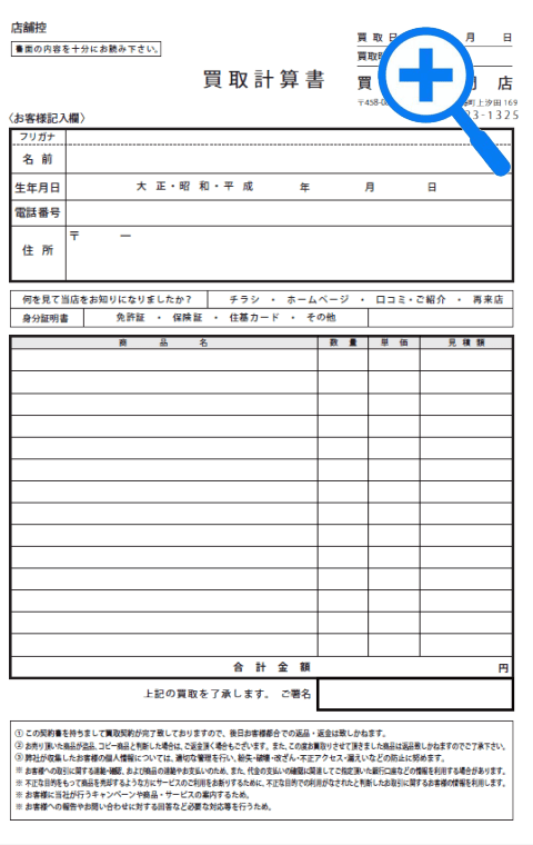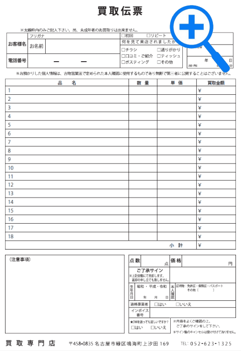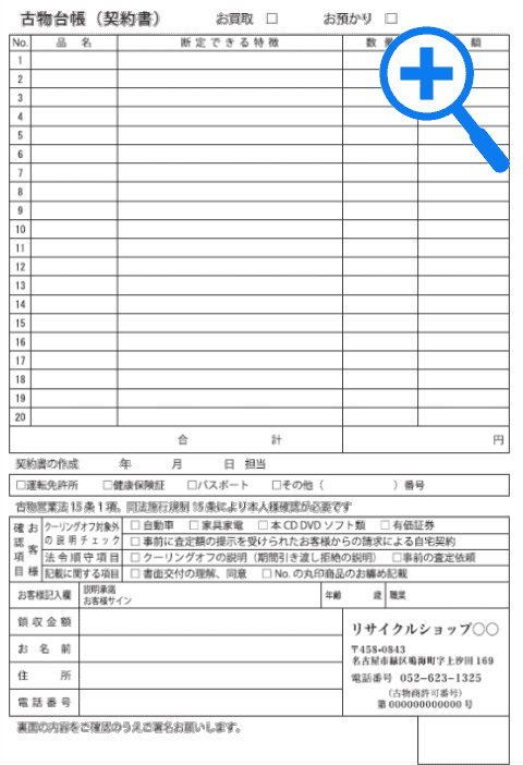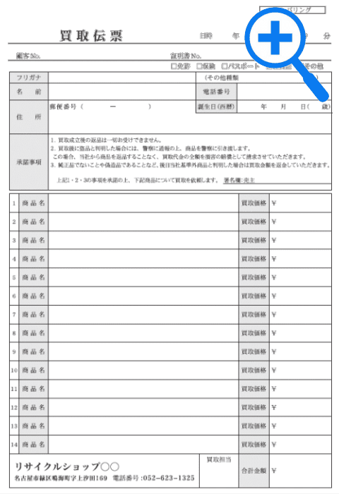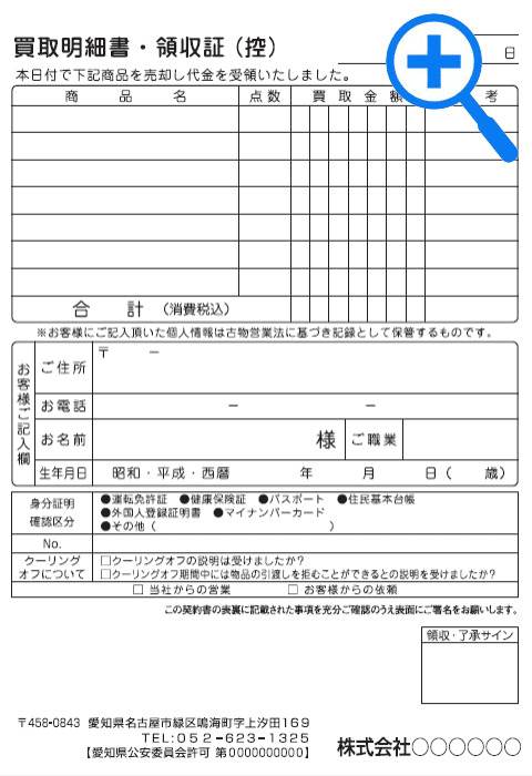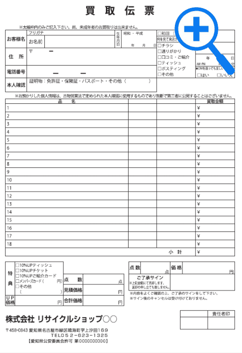 不用品買取・リサイクルショップ・質店など古物商向けの手書き伝票をオリジナルで作成します。買取の形態やお店ごとの条件に合わせて、使いやすくカスタマイズします。現在お使いの伝票をもとに「そのままの形」で再現も可能です。