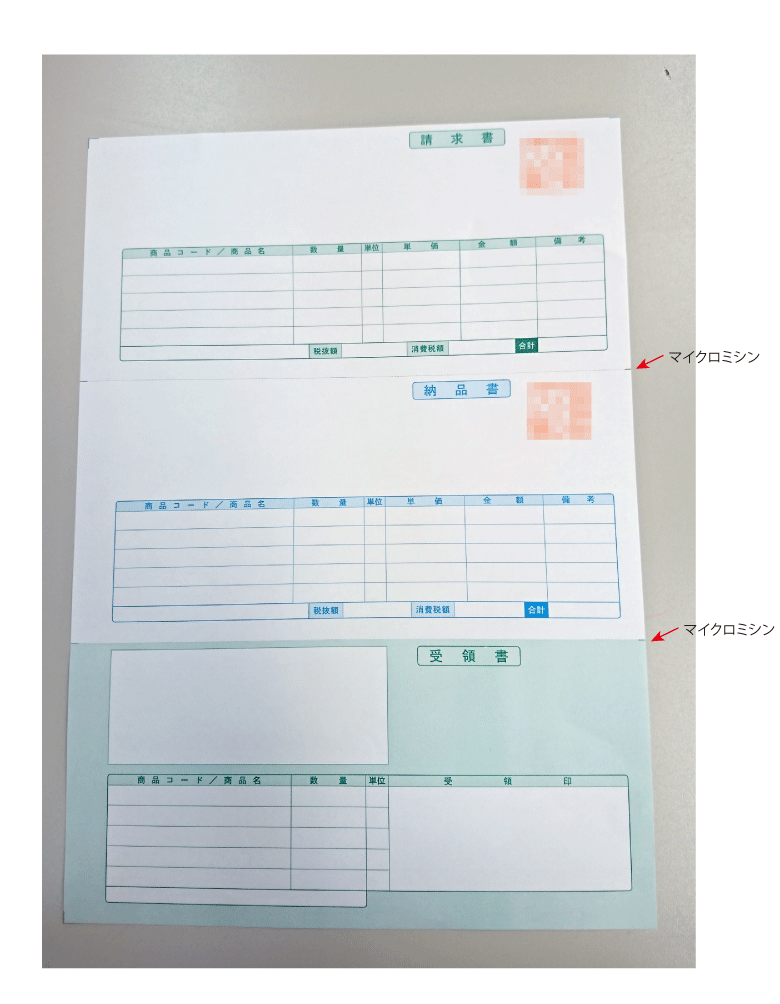 また2分割や3分割のミシン目を入れることができ、またファイリング用の穴もあらかじめ開けることができるので便利で使いやすい帳票となります。
